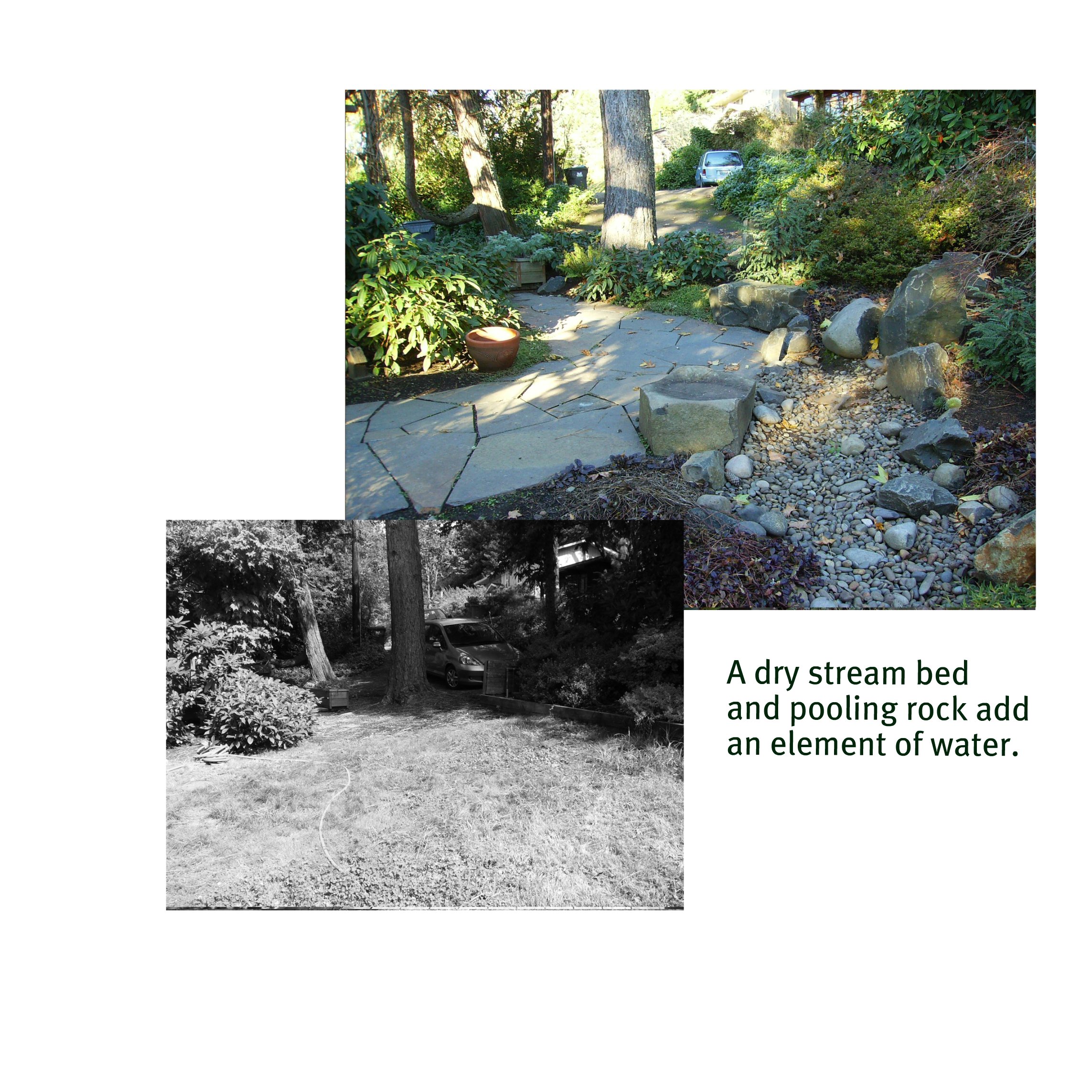 We created a rustic stone walkway to connect the front entrance to the side deck. Near a large seating rock there is a stone bowl that holds water year round, and creates a quiet and beautiful place for contemplation.